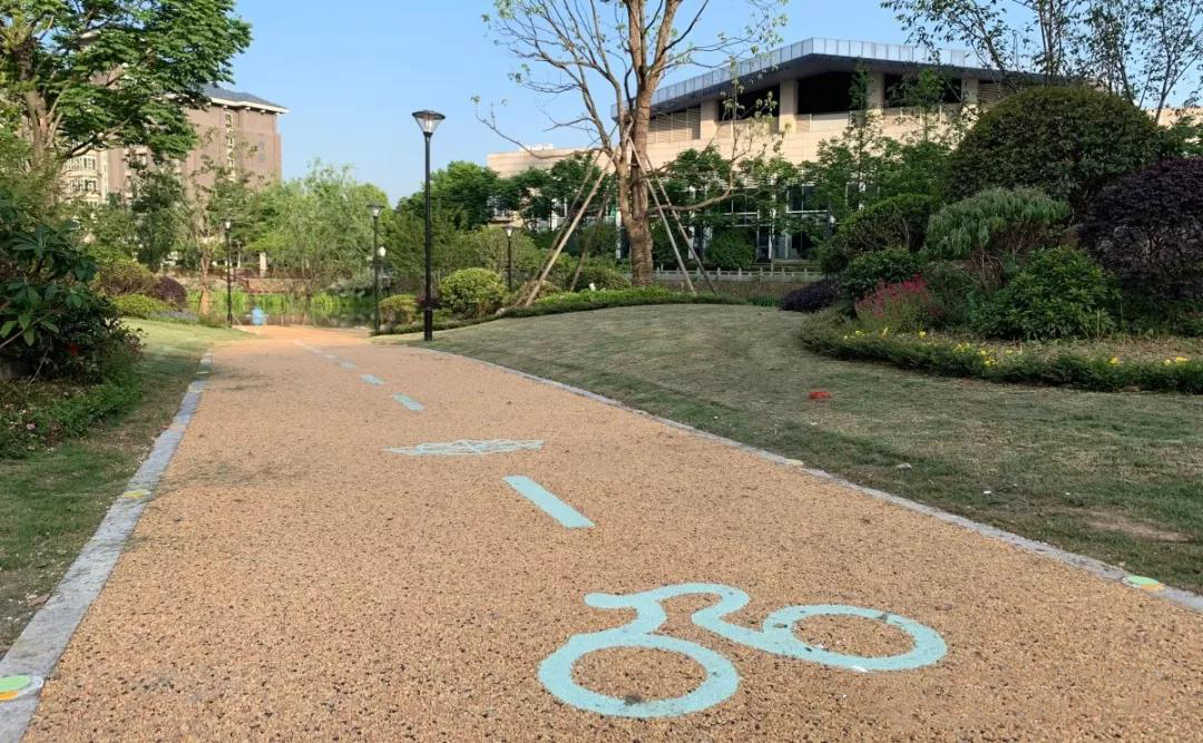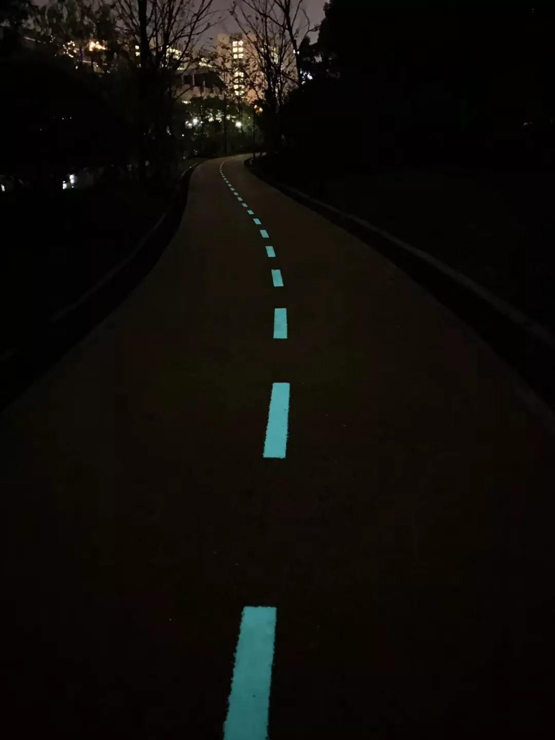 这条夜光跑道就在新桥港北岸(良睦路与向往街交叉口),全段总长约1公里,主体由一颗颗黑色、黄色、米色的小石子组成,中间部分的分割线则是一颗颗绿色石子组成。