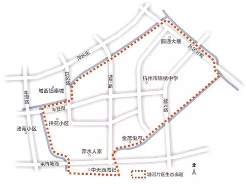 拱墅区环河健康绿道集智慧运动、休闲娱乐、生态休憩、主题设施于一身。绿道全长5公里,呈环形,起止点为余杭塘路与庆隆河交叉口,沿线串联起阮家桥港、婴儿港、庆隆河、余杭塘河、石桥港、丰潭河6条河道,以及庆隆苑、黄龙金茂悦、首开金茂府、天阳尚景国际、上尚庭、拱苑小区、政苑小区、城西银泰城等申花板块内的多个住宅小区、城市综合体。